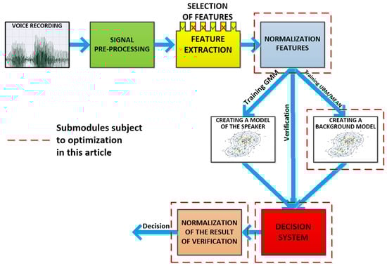 The structure of the ASR system described in this article is shown in Figure 2. The remainder of this section describes the individual modules of the ASR system in more detail, starting with the speech acquisition and signal pre-processing processes and the associated proprietary methods for selecting the processed speech frames. Another element of the operation of the presented voice biometrics system is the process of extracting, selecting, and normalizing the unique characteristics of the speaker’s voice. The process involved cepstral analysis of the speech signal as well as a genetic algorithm. This is followed by a presentation of the classifier used, using Gaussian mixture models, which is a memory-efficient and individually information-rich classification method. The next stage of processing is the decision-making process and the normalization of the final speaker verification result.