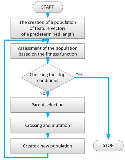 In the system presented here, the authors used a genetic algorithm to select the most representative features of the speaker’s voice. This method takes into account the synergy of the features and makes it possible to obtain an optimal set of them; however, it is time-consuming. The working principle of the implemented feature classifier using a genetic algorithm is shown in Figure 5. In contrast, a detailed description of the genetic feature selector created by the authors is described in the article [34].