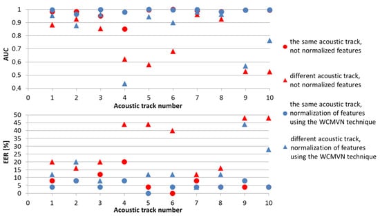 The first experiment conducted was to verify the speaker verification results obtained using a multisession voice dataset consisting of recordings of 50 speakers recorded on 10 independent acoustic tracks at a sampling rate of 8 kS/s [46]. This allows the performance of voice biometrics to be tested in a varied acoustic environment, making the presented results more realistic (red markings in Figure 6). An attempt was also made to additionally normalize the signal’s distinctive features by including the mean value of a feature and its standard deviation in the processed signal frame WCMVN [28] (blue markings in Figure 6). The results also include two options for how to test the ASR system. The first allows the system to be tested using the same acoustic tracks that were used to create the voice models (indicated by the circles in Figure 6). The other (more complex) requirement, on the other hand, requires that different acoustic tracks are used when testing the ASR system than those used when creating the voice models (indicated by the triangles in Figure 6).