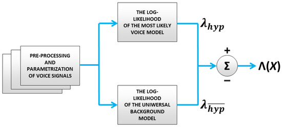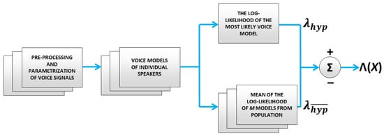 During the speaker identification process, a decision is made as to which of the speakers represented by the λk voice models (for k = 1, …, N, where N is the number of voices in the considered dataset) is most likely to belong to the recognized fragment of the voice signal represented by the set of personal feature vectors X. The discrimination function then takes the form [37].