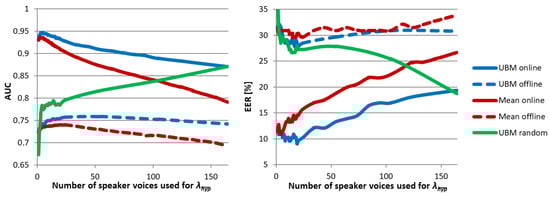The first option involves selecting the closest voices from the dataset to the speech fragment to be verified (online), which will then be used to create a reference model . The second (offline) option, on the other hand, involves selecting the closest voices to the speaker model created during learning and then creating a reference model based on this . In addition, results for a UBM created from randomly selected voices from the base (green line) are also presented.
