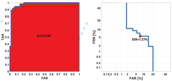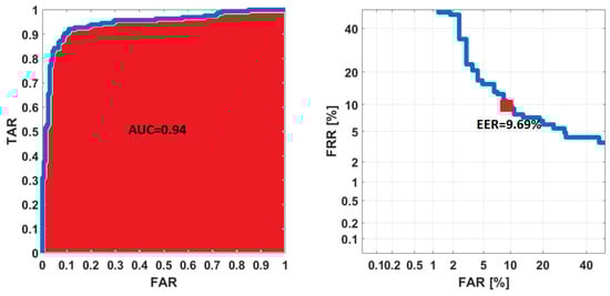 Figure 10 shows an illustration of the operational curve (ROC) and the detection error trade-off (DET) curve for the most favorable option. In addition, the exact values of the area under the curve (AUC) and the equal error rate (EER) are presented.