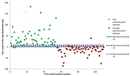 A total of 55 speakers were experimented with in three rounds, allowing the results of 110 logins to be collected (55 to their own account and 55 to another user’s account as an intruder). Figure 11 provides an illustration of the reliability quotient results obtained when trying to log in to one’s own account (green circles) and another user’s account (red circles). The experiments were carried out with a fixed decision threshold of “0” (blue line), resulting in an accuracy (ACC) classification score of 91.82% from 110 logins to the system.