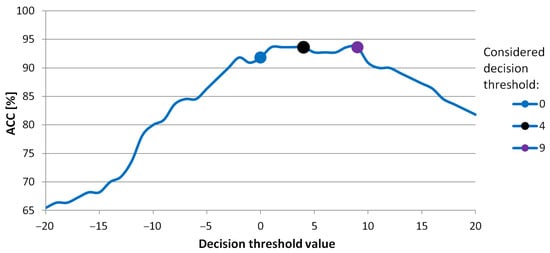 A selection of decision threshold values (Figure 12) was also made, which resulted in a significantly higher classification accuracy of 93.64% for decision thresholds “4” (black point) and “9” (purple point).