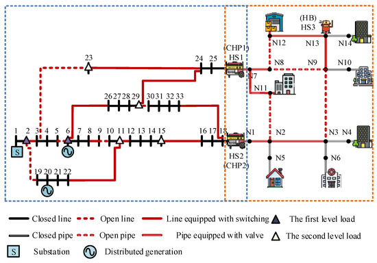 DHS reconfiguration is an imperative tool for PDS resilience enhancement [19,20]; nonetheless, it has not been considered in the collaborative recovery process of integrated electric and heating systems (IEHSs) for enhancing the overall system resilience. PDS reconfiguration could achieve uninterruptible power supplies in non-faulted regions and adjust the power generation of CHP units after natural disasters to accomplish better service restoration, which has great potential for resilience enhancement of IEHSs.