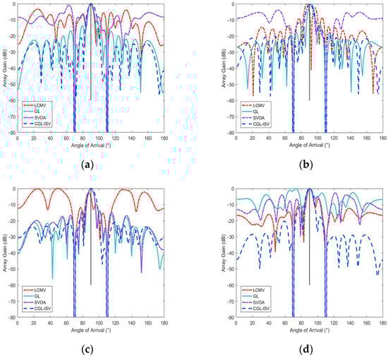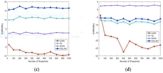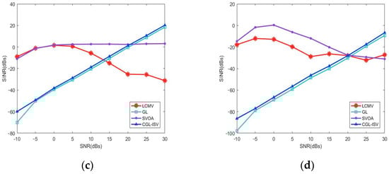 In Experiment 1, we simulated beam patterns without steering vector mismatch and the actual case with steering vector mismatch, respectively. Subsequently, the performance of the LCMV algorithm, the GL algorithm and the CGL algorithm in the beamforming domain is compared in Figure 1, where Figure 1a shows the beam pattern without steering vector mismatch and Figure 1b shows the presence of a 2° steering vector mismatch. Figure 1c shows the beam pattern for an array element position perturbation deviation of 0.02 mismatch, and Figure 1d shows the beam pattern for a position perturbation standard deviation of 0.20 mismatch.