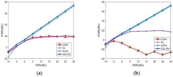 The simulation scenario of Experiment 2 is the same as that of Experiment 1, which represents the relationship between the output Signal to Interference and Noise Ratio (SINR) and the input signal-to-noise ratio. The SNR was taken to vary from −10 dB to 30 dB in 5 dB intervals and 200 Monte Carlo experiments were performed at each SINR to count the output SINR of the array, as shown in Figure 2. Observing and comparing the plots in Figure 2, we can conclude that the GL algorithm, SVOA algorithm and CGL-ISV algorithm outperform the LCMV algorithm, especially the CGL-ISV method, at higher signal-to-noise ratios. Through careful analysis, we can observe that the GL algorithm, SVOA algorithm and CGL algorithm perform quite consistently in ideal scenarios without mismatches. All three algorithms, on the other hand, remain stable in the mismatch condition because of the correction made to the steering vector. However, the GL algorithm has an advantage over the CGL-ISV algorithm in that the output SNR increases gradually, with an increasing SNR at higher-input SNRs in both the ideal case of no mismatch and the actual case of mismatch. Compared to the other algorithms, the CGL-ISV algorithm has a better performance with the highest output SINR.
