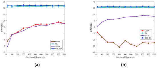 In Figure 3, when there is no array perturbation or steering vector mismatch, the output SINR of the LCMV tends to increase with the number of snapshots and the beamformer performs well. Once a mismatch occurs, the output SINR drops sharply as the number of snapshots increases, resulting in a degradation in beamformer performance. This is because when a mismatch occurs, the LCMV method treats the desired signal as an interfering signal, which is particularly noticeable at a high SNR. Even if the number of snapshots increases, the SINR does not increase. On the other hand, the CGL-ISV method has a better SINR performance than LCMV. This is because even if there is an error in the system due to the steering vector mismatch, the error can be moderated by the correction of the CGL-ISV algorithm. Thus, the CGL-ISV algorithm can improve SINR performance when there is a steering vector estimation error. However, the output SINR of the CGL-ISV-based beamforming algorithm does not change significantly with an increasing number of snapshots, both in the ideal case without mismatch and in the presence of mismatch, thus demonstrating an extremely stable performance.