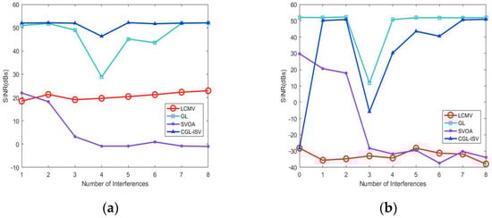 As can be seen in Figure 4, the performance of the LCMV and the SVOA is quite stable in the absence of mismatch, independent of the number of disturbances. In the presence of a 2° mismatch in the steering vector, the LCMV remains stable, but the output SINR is not as superior. The GL and CGL-ISV algorithms, on the other hand, perform reasonably well at low disturbance counts, with CGL-ISSV maintaining a particularly good performance at higher disturbance counts. In the presence of a 2% wavelength array perturbation, the LCMV, SVOA, and CGL-ISV maintain good performance overall, with the CGL-ISV algorithm maintaining a particularly superior performance at low interference counts. In the presence of a 0.20 perturbation, the output SINR of LCMV and SVOA algorithms increases with the increase in interference number, because the two algorithms can still maintain effective zero-trapping for interference in the presence of 0.20λ perturbation. With the increase in interference number, more interference is suppressed, increasing the strength of the received effective signal. However, GL and CGL-ISV algorithms still maintain their superior performance under low interference.