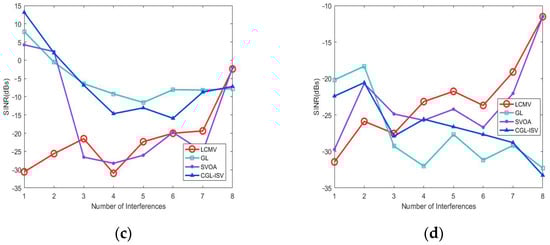 Output SINR versus interference. (a) Output SINR versus interference under non-mismatch scenario. (b) Output SINR versus interference under 5° mismatch scenario. (c) Output SINR versus interference under 0.02 position perturbation. (d) Output SINR versus interference under 0.20 position perturbation.