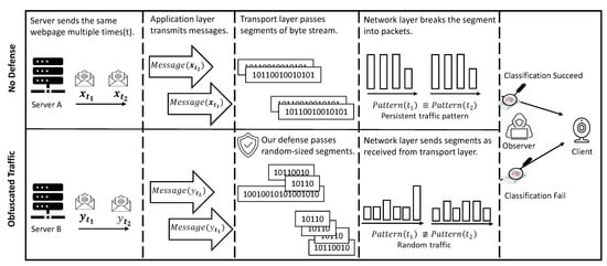 In the first scenario, the server with no defense sends data in a typical packetized flow, leaking exploitable signatures for fingerprinting attacks. In contrast, the second defended scenario shows that randomization occurs at the transport layer. Specifically, our technique passes random-sized segments to the network layer. Consequently, the traffic pattern generated by our shaping technique is challenging to classify.