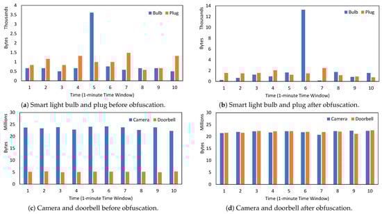 Figure 2 presents a sample traffic flow observed over a period of 10 min before and after implementing our defense. Before obfuscating the traffic, we observed variable traffic patterns in the light bulb and smart plug. Specifically, the bulb’s traffic was higher than the plug’s in seven instances, lower in two instances, and similar in one case (Figure 2a). This inconsistency in traffic poses a challenge for reliable device profiling based on data-volume-related features. The impact of this variability is evident in the spike in bulb traffic (Figure 2a, traffic period 5), which was misclassified as camera traffic.