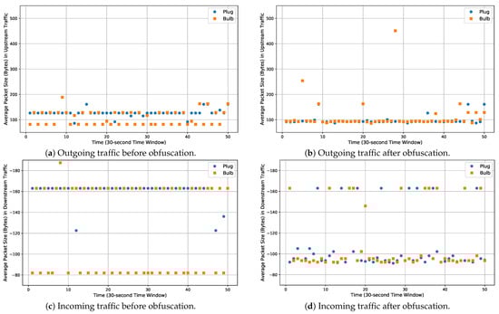 Figure 3 illustrates the impact of our approach on the packet size. We chose the bulb and plug for demonstration as they rely entirely on random segmentation for packet-size obfuscation (i.e., no covered bytes were injected). Before implementing our defense, we can notice in Figure 3a a steady average size (nearly 130 bytes) sent by the plug versus fluctuating value by the light bulb. (After subtracting the frame header (82 bytes), a data frame of 130 bytes means there are 48 (i.e., 130-82) bytes in the payload for the segmentation.) We can observe similar behavior in the return traffic represented by negative values in Figure 3c. After obfuscating the traffic (Figure 3b,d), the described range of each device starts to overlap, introducing uncertainty in the learning process for device classification.