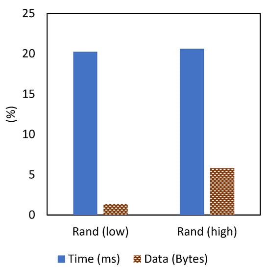Furthermore, we implemented two randomization levels to analyze the impact of the obfuscation intensity (i.e., range of random values) on T. The wider the range of random lengths, the more packets are required to carry the payload. Consequently, more packets might take a longer time to deliver. For instance, sending a large array of data using random-sized packets ranging from 100 to MTU will result in significantly more packets than using a range of larger lengths between 1200 and MTU. For this experiment, we define two randomization levels ( and ) with an upper bound of a common maximum length of 1400 bytes, whereas the lower bound of each level varies as follows: 1200 and 100. We run ten sets of experiments and report the average result in the following section.