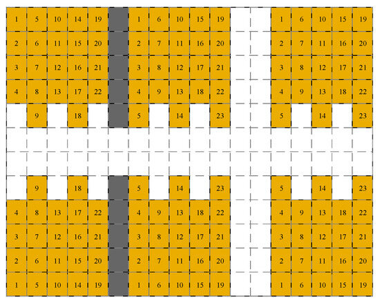 Figure 17 exhibits the filling sequence of the traffic-jam-removing strategy. The difference between this method and the greedy strategy is that the previous one simultaneously considers in Equation (3). One stack in shelf cluster is filled in the first quarter of the period, and both the decision failure times and the end time pertaining to the traffic jam removal approach reduce compared to the greedy strategy. Thus, a simple additional function of can slightly further characterize the difficulty of the trajectory planning. Meanwhile, because the filling sequences of these two strategies are similar, the figure pertaining to the greedy method is omitted. As shown in Figure 17, it basically evenly fills shelf clusters , , and in the first quarter of the period. The majority of stacks in and around a third of stacks in are filled in the last quarter. Considering four vehicles cooperatively delivering goods, violations between trajectories evidently arise, and the times of failure in trajectory decisions and the waiting time can increase markedly.