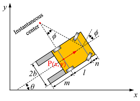 As reported in Figure 3, a forklift can be described as a front-steering vehicle if the fork part of the vehicle is treated as the rear side. The corresponding kinematic formulas write: