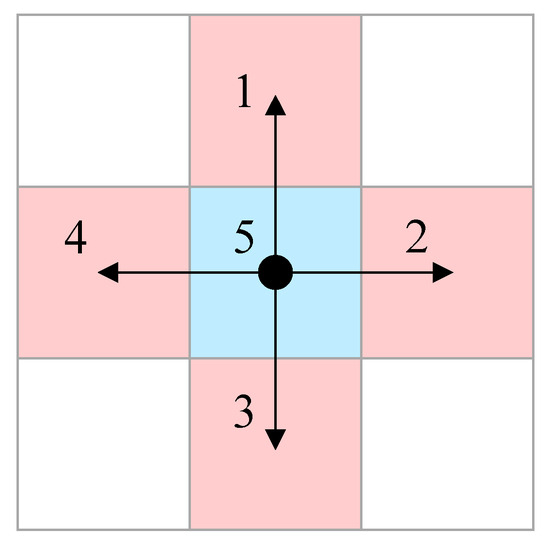 A scoring system is applied to decide the goal coordinate of the new subtask. First, the function is initially employed to ascertain whether the planned trajectory involves heading to clusters or returning. The functions and are then applied separately depending on whether the goal is a rack cluster or a picking station. In both functions, the grid networks, outlined by light colors in Figure 2, indicate the nodes used to define the location of a vehicle and stacks. The resolution of such nodes is purposely reduced with the aim of lowering computation costs. Given that the nodes are defined, a time dimension involved preliminary A* search algorithm, whose expansion manner is presented in Figure 4, is used to generate preliminary trajectories that link the starting pose at instant to each potential target coordinate. Five patterns in total for this search algorithm are applied to vaguely indicate the possible maneuvers a vehicle could perform. In particular, manner 5 in Figure 4 expands only in the time dimension, representing the stopping condition of a virtual forklift. The time consumed derived from this algorithm for a virtual vehicle represented by one node is then applied as a parameter to evaluate the difficulty grades of reaching different goal poses. Other vehicles and walls are treated as obstacles during the search. Notably, the orientation angles for the initial and final poses are not required to be determined in such a system. Thus, is not considered a dimension in this search for the sake of calculation simplification.