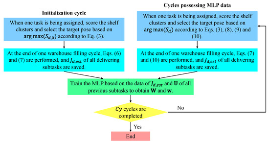 After the initialization cycle of warehouse filling (referring to Figure 6), the training process can continue until cycles are finished. In the following cycles, the MLP has already been established depending on the data pertaining to the previous cycles, and the saved values of and are used to estimate the values via Equation (8). Therefore, the base values of the MLP outputs are replaced by in Equation (9) when shelf cluster is considered. The expression of the corresponding element in for the following cycles writes:
