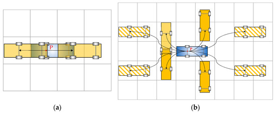 This section elaborates on the various possible expansion manners denoted as , with each individual possibility represented by . The drivable area is initially mapped with the above-discussed grid networks (cf. Figure 2). The dimensions of the grid should be skillfully coupled with the size of the vehicle, with the aim of reducing occupied cells during a certain action and enhancing the utility rate of the space. The case demonstrated in Figure 7 is a well-designed example. In this case, one vehicle covers two grid cells. Thus, on a 2D space domain, the orientation angle involved in forklift movements can be easily described. In addition, through one maneuver, the vehicle body occupies a small number of grids. This can reduce the possibility of interference with other forklifts during motion planning.