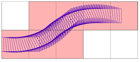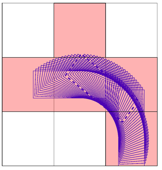 As far as the expanding manners are concerned, when remains 0, one vehicle stops. As is other than 0 with steering angle , one fork can go or reverse straight. Figure 8 demonstrates one modeled forklift path depicted by consecutive outlines, when the vehicle goes upward and turns to the left from the right lower side to the center left. Through this maneuver, is varied to gain an identical final location relative to grids as the initial state, despite the change of in . Under such circumstances, the consecutive motions can be easily established. Meanwhile, the modeled maneuver of reverse turning to the left can also be noted in Figure 8, when the initial and final body outlines are exchanged.