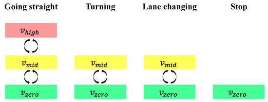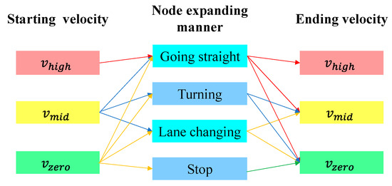 The velocity planner determines the node expansion rule in the time domain and the potential node arrival instants. When one maneuver starts or finishes, the vehicle speed solely falls into one of three determined constants (, and ), which correspond to high speed, mid speed, and zero speed. Figure 10 reports all possible velocity selections linked to the start and end of the maneuvers. can only be selected with the expansion pattern of going straight to fulfill the kinematic constraints given by Equations (1) and (2). The stop maneuver is an expansion of finite value solely on the time domain, it follows that only can be applied to this action.