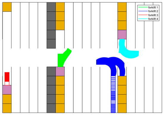 Figure 12 reports how forklift 1 returns to a picking station from shelf cluster , where it has just unloaded goods. Before the start of the scenario, forklifts 2 and 4 are in the same state of return, and forklift 3 is unloading in shelf cluster . When the scene in Figure 12 starts, forklift 1 accelerates and decelerates to reverse to the entrance of shelf cluster . At the meantime, forklift 4 turns and heads to the picking station , leaving the crossing of the wide passages empty. With the purple square showing the newly filled stack, forklift 3 leaves shelf cluster and enters to finish turning round. When it is inside of , forklift 1 goes through the passage between and . Subsequently, forklift 1 reverses and turns to the picking station , and forklift 3 then enters the wide passages to return to the assigned picking station, which is . Finally, forklift 2 is the first vehicle that arrives at the crossing area of wide passages with the goods picked. During the scenario, all trajectories are directly determined by means of the approach elaborated on in Section 4. The least priority is dynamically offered to the newly departed vehicle. For instance, in this scenario, forklift 3 initially has the lowest priority. Thus, it should judge if there is enough time for the vehicle to turn around. Therefore, if the time is limited, vehicle 3 would wait at the entrance of , until the passing of forklift 1.