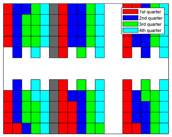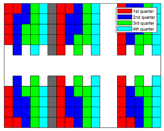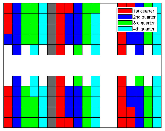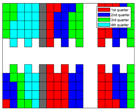 In Figure 15, Figure 16, Figure 17 and Figure 18, the sequence in which the warehouse is filled with different methods is reported. The colored blocks plotted in the schematic warehouse stand for the stacks filled during different periods (red for the first quarter of time, blue for the second, green for the third, and cyan for the last). It is observed that the filling of different shelf clusters for the ANN combined strategy (cf. Figure 15) in different quarters of the period is balanced to a certain extent. There are, respectively, 35, 37, 34, and 30 stacks filled during each quarter. Particularly in the last quarter of the period, similar numbers of stacks filled are distributed within all six shelf clusters, and this provides a possibility for a feasible and fast solution to filling the warehouse.