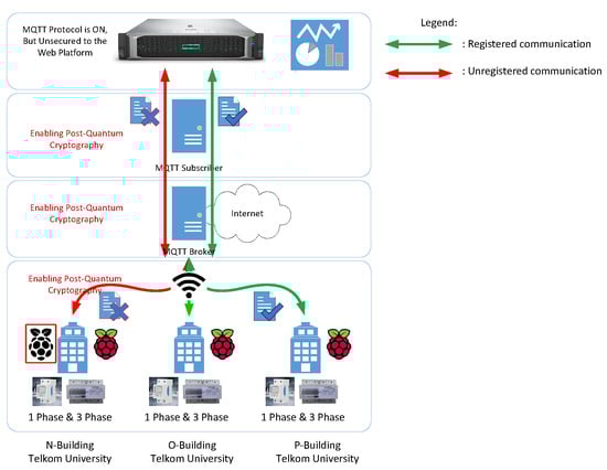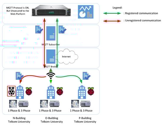 The secure energy monitoring system proposed in this research has been implemented internally in buildings N, O, and P of Telkom University, as depicted in Figure 1. This implementation utilized four Raspberry Pi-4 (RPi-4) units, one AP, and one HPE ProLiant server equipped with an HTTPS service. Three of the RPi-4 units served as registered IoT devices, while the fourth acted as an unregistered IoT device. This setup was designed to simulate an insider attack scenario, where the attacker could be an employee, contractor, or any external party with physical access to the system. Specifically, there is a risk that an adversary could breach the local network when the IoT system operates on its default configuration, even if the message queuing telemetry transport (MQTT) protocol is active. Thus, the IoT system should prohibit access to unregistered devices. A more detailed discussion follows in the next section.