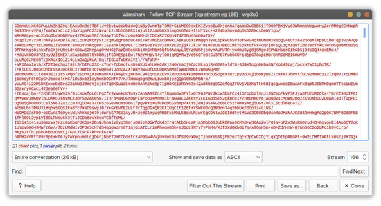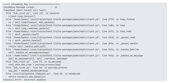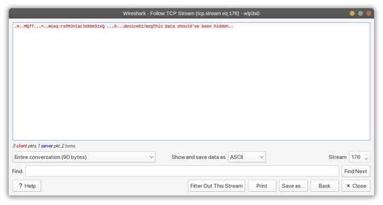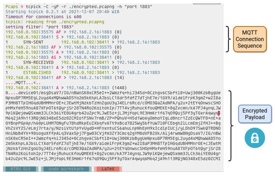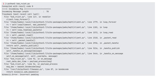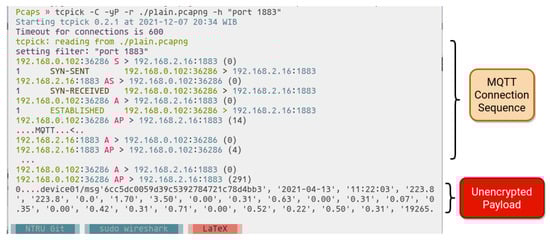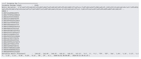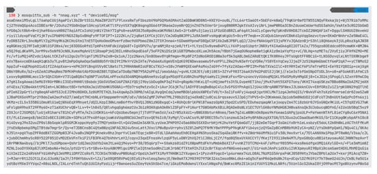 Each encryption algorithm was successfully implemented on RPi-4 from 27 January 2022 until time of publication. There were only 500 transmitted pieces of data taken from the ESM server for the testing phase. As a comparison with conventional MQTT, Figure 3 shows the examples of ESM transmitted data in one-phase. The generated data were different from the data in the three-phase, but only in the data length. For example, the plaintext data sent from registered RPi-4 were "device_id, voltage, current, and power"; even by enabling MQTT, the message still can be derived as plaintext. This verifies the possibility of eavesdropping by unregistered RPi-4 in a public network. Meanwhile, Figure 4 shows that the adversary still can conduct sniffing, but the messages that have been received will be meaningless without the private key.