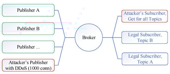 Based on Figure 5, the publishers send data to the subscriber through a broker using the MQTT protocol based on the topics that have been created by the publishers. If the broker and subscriber are streamed through the internet, it is very possible that several attacks may occur and could be harmful to the whole system. Figure 5 also shows the possibilities of adversaries acting as publishers or subscribers. The attacks tested on this ESM were data privacy, authentication, data integrity, and DDoS mitigation.