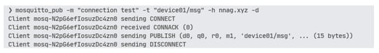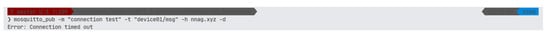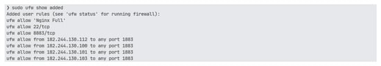 A whitelist, as shown in Figure 12, is used to overcome DDoS on the broker’s devices. In other words, only devices on the whitelist are allowed to transmit through the broker using the MQTT protocol as shown in Figure 13. Figure 14 shows that the adversary, who is not on the list, performs the DDoS, and the device is automatically rejected with the message, “Error: Connection timed out”. Furthermore, on the firewall side, a schedule can be made to carry out periodic monitoring and show the firewall log on the broker, as shown in Figure 15.