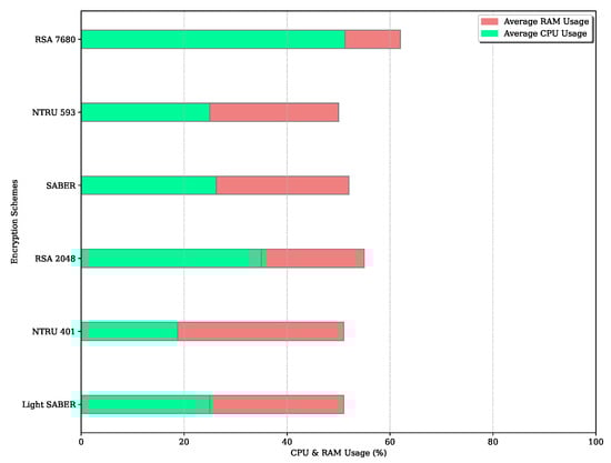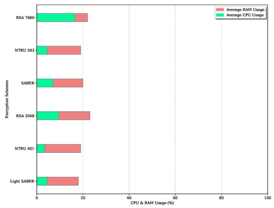 Figure 16 and Figure 17 show the average CPU and RAM usage of the RPi-4 while running the RSA, NTRU, and SABER encryption and decryption for more than 500 payload transmissions using MQTT protocol. The average RAM consumption for the encryption process in the 128-bit security level was 37% for RSA-7680, 18% for NTRU-401, and 26% for Light Saber. While in the 196-bit security level, the average RAM consumption was 53% for RSA-2048, 24% for NTRU-539, and 27% for Light SABER. The average CPU consumption for the encryption process in the 128-bit security level was 37% for RSA-7680, 18% for NTRU-401, and 26% for Light SABER. In the 196-bit security level, the average CPU consumption for the encryption process was 53% for RSA-7680, 24% for NTRU-539, and 27% for SABER. The average RAM consumption of the decryption process with a 128-bit security level was 8% for RSA-2048, 3% for NTRU-401, and 4% for Light SABER. With a 196-bit security level, the average RAM consumption was 18% for RSA-7680, 3% for NTRU-539, and 7% for SABER. The average CPU consumption of the decryption process with 128-bit security was 23% for RSA-7680, 18% for NTRU-401, and 16% for Light SABER, while, with 196-bit security, it was 22% for RSA-7680, 19% NTRU-539, and 20% for SABER.