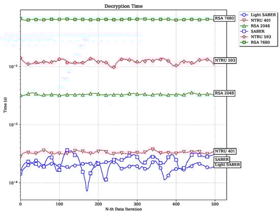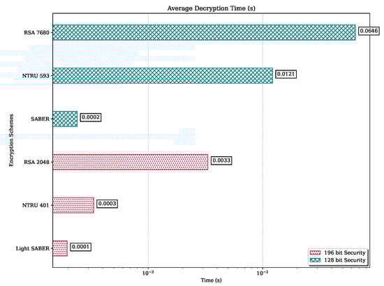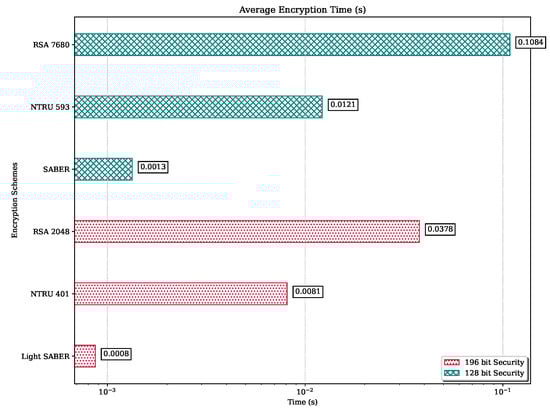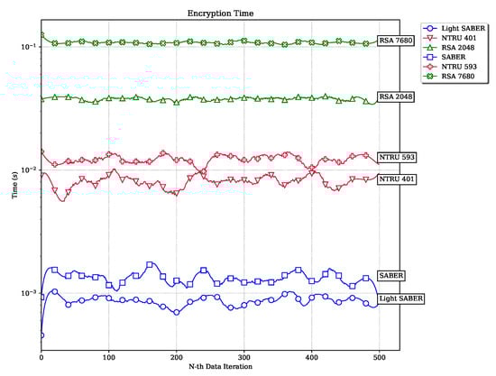 This research customized and adopted the RSA-2048, RSA-7680 [45], NTRU-401, NTRU-593 [46], SABER [47], and Light SABER [48] standards. The NTRU and SABER encryption systems with these standards have a low computational load, but the encrypted character length is limited. The character length that can be encrypted in the NTRU and SABER encryption systems is only 16 bytes for the 128-bit security and 32 bytes for the 196-bit security.