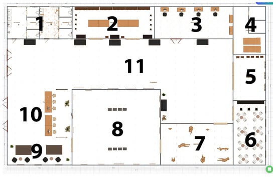 Finally, Figure 3 contains a visual representation of the second floor and Table 3 accommodates short descriptions for each area. A total of 41 sentences or paragraphs have been used to describe the second floor. The reason for having more instructional texts here is that 15 contemporary art objects found in the Experimental Gallery room have been detailed. Each of these objects was given a name, a description, and some information about their creator. Accordingly, for the other two main areas of the floor, it was considered that there was an event that was running or starting later on the current day, and descriptions were provided for the titles of the events and their creators.