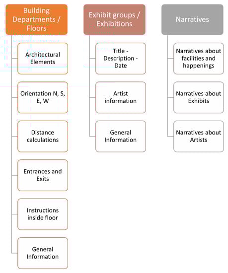 Although there is a wealth of existing literature related to the design of a museum, and a virtual museum in particular [,,,,,], in the current work, no specific methodology has been selected. The reasons for not adhering to existing design practices can be summarized in the following points: (i) it is desired for the LLM to work and be able to perform outside of any form of known museum design rules; (ii) the specific virtual museum will not be accessible to visitors; (iii) at this stage, the objective is to assess the LLM’s ability to learn about the designed museum in detail, so that it can then recommend the next exhibit or route.