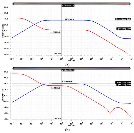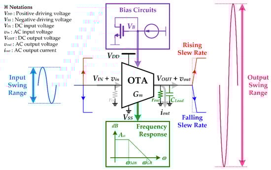 Here, ro in (21)–(23) is K times lower than ro in (2)–(4) since ro of a single transistor is inversely proportional to the bias current at equilibrium. In this regard, rout,CM_OTA in (21) is K times lower than rout,5TR_OTA in (21). As a result, theoretically, Ao,CM_OTA in (22) is the same as Ao,5TR_OTA in (3). In contrast, ω3dB,CM_OTA in (23) and ωGB,CM_OTA in (24) are K times lower than ω3dB,5TR_OTA in (4) and ωGB,5TR_OTA in (5), respectively.
