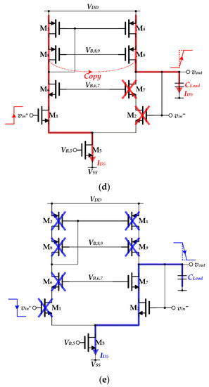 Figure 5d,e, the current flowing through PMOS at the output node determines a rising SR in a current mirror OTA, denoted as