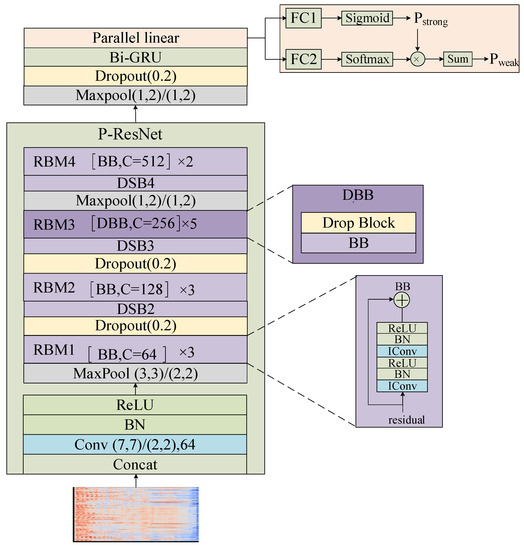 The detection network, established in this paper—namely, P-RRNN—is depicted in Figure 2. To leverage the ResNet34 model, which was originally trained for image classification tasks, in SED tasks, we propose an optimized structure named P-ResNet. This structure retains the overall framework of the original model while modifying specific layers for enhanced performance. The P-ResNet model makes the following two improvements over the ResNet34 model: