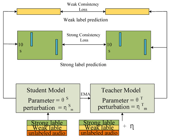 Specifically, the improved mean teacher model consists of a student model and a teacher model, forming a semi-supervised learning approach (Figure 4). The training data consist of three parts: unlabeled data, weak labels, and strong labels. The teacher and student models both have the same P-RRNN structure but different model parameters, denoted as and , respectively.
