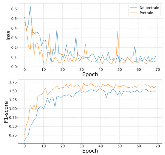 In this study, to validate the impact of P-ResNet pre-training on the detection system, the training curves of the student model under the influence of pre-training on the DCASE 2019 Task 4 development set are shown in Figure 5.