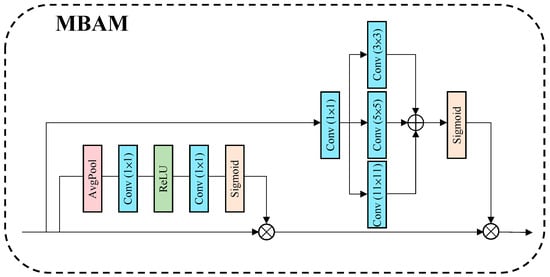 The use of large convolutional kernels in SPI networks based on attention mechanisms enables a more compressed undersampling of the output feature map. However, the use of large convolutional kernels is limited in the feature extraction part because of the large number of computational parameters they add to the network. Therefore, we propose a multi-scale balanced attention module, MBAM, which captures the multi-scale patterns of upsampled feature maps using dilation convolution. MBAM consists mainly of dilation convolution with a convolution kernel size of 3 and a dilation rate of [,,]. Figure 3 shows the structure of MBAM.