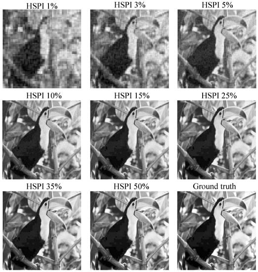 The proposed method was tested on different types of salient targets, including a bird, butterfly, zebra, pepper, baboon, and face, in order to verify its effectiveness. In order to observe the degradation of the undersampled reconstructed image, a test image (Bird) was selected to simulate the HSPI compression reconstruction, and the sampling rate was chosen as 1–50%. Figure 5 illustrates the reconstruction results.