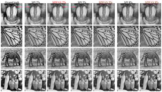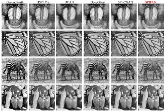 To verify whether the proposed method can help conventional HSPI to improve the quality and visual effect of the reconstructed images, the undersampled signals after the degradation model reconstruction were fed into SPIFAN for optimal reconstruction. Ground truth, HSPI reconstruction, and SPIFAN reconstruction were compared qualitatively and quantitatively with sampling rates S of 2%, 5%, and 8%, respectively, and peak signal-to-noise ratio (PSNR) and structural similarity (SSIM) were chosen as evaluation metrics for the images []. The Ground truth and reconstruction results are shown in Figure 6.