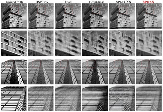 Figure 8 shows the reconstruction results of each algorithm for the target scene with S = 5%, and the magnified portion allows a clearer view of the background and underlying details in the image. Clearly, only the SPIFAN reconstruction is capable of capturing the details of the image efficiently. The DCAN reconstruction is too smooth and loses image detail. The artifacts in the DeepGhost reconstruction severely damage the underlying features of the image. However, the DeepGhost reconstruction showed a significant reduction in image brightness, while the SPI-CGAN reconstruction produced a large number of artifacts. The mean values of the quality metrics of the reconstructed images for the Urban100 dataset for each algorithm are shown in Table 3.