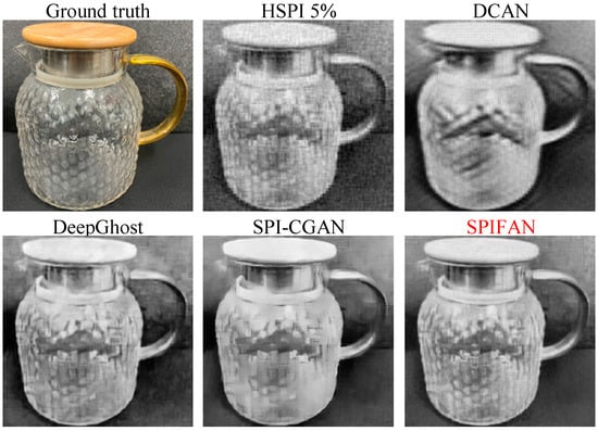 In physical experiments, a kettle is used as the target scene, which has a clear external outline and a complex surface pattern. This target scene can be used to test the performance of the algorithm by reconstructing it. We measured the target scene by setting S = 5% Hadamard mode and then reconstructed it using the proposed SPIFAN with other algorithms, as shown in Figure 9.