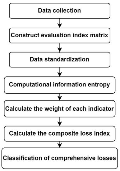 The Entropy Weight (EW) method determines the weight of indicators [21] according to the amount of information transmitted by each indicator. This method can reflect the importance and difference among indicator data, and the evaluation results are objective [22]. The entropy weight method is mainly divided into three steps in the comprehensive loss assessment of a flood disaster. Firstly, the comprehensive loss assessment index of the flood disaster is determined. Secondly, the comprehensive loss index of the flood disaster is calculated using the entropy weight method. Thirdly, the comprehensive loss level of the flood disaster is calculated. The specific process is as follows: