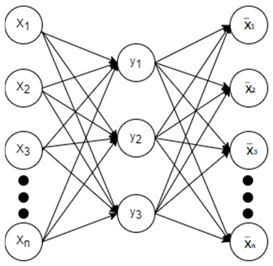 Autoencoders represent a well-established unsupervised learning technique, with the earliest conception being introduced by Rumelhart et al. [27] in their seminal Nature paper. The autoencoder’s encoding process involves transforming high-dimensional inputs into low-dimensional hidden layers, while the decoding process entails converting the low-dimensional hidden layers back into high-dimensional output layers. The loss function is defined by comparing input and output disparities, aiming to enhance the alignment between network inputs and outputs. Within the autoencoder framework, unsupervised learning enables the extraction of features from hidden layers and the acquisition of parameter adjustments. A schematic depiction of the autoencoder’s architecture is illustrated in Figure 2.