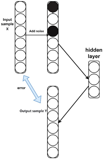 This is done by first corrupting the initial input into by means of a stochastic mapping [30]. In the formula, is the sample after adding noise; is random noise with a binomial distribution, indicates a mapping.