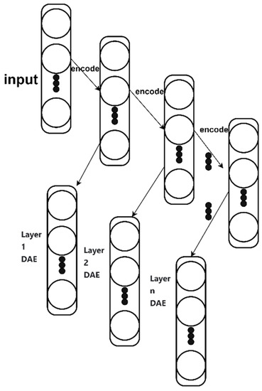A stacked denoising autoencoder (SDAE) comprises multiple denoising autoencoders stacked layer by layer, where each denoising encoder’s output serves as the input for the subsequent encoder layer. This layered arrangement creates a model structure consisting of interconnected DAE layers, facilitating improved feature expression. Vincent et al. [30] introduced the SDAE network model, which not only prevents the autoencoder from solely learning the identity mapping between input and reconstructed output but also captures more effective representations from noisy data. In comparison to a regular autoencoder network, SDAE’s learned features exhibit greater robustness. The architecture of the SDAE network is depicted in Figure 4.