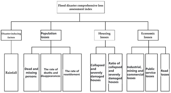 The selection of comprehensive loss assessment indicators for flood disasters is shown in Figure 5.